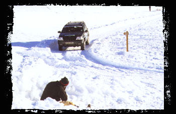 Photo shoot on snow plainThis year the organisation had created an igloo village up on the side of the ski slopes at Merlette. There was a function with a laser display and the chance to sleep in the igloos if you desired. The only drawback was that you had to get the cablecars up and then walk for 20 minutes to get to the site. Once there you couldn't get back down for 3 hours. This put a lot of people off as it was bloody cold at night, and the thought of being stuck up there didn't appeal. I actually had an excuse not to go as I was fixing Kenny's brakes down the other end of the valley, however it would have been nice to see it. Having got Kenny sorted out it was back to Relaise de Merlette for a late supper and a chance to socialise with some of the others. Amongst the other British entrants were David Seager-Thomas and Rod Leighton in the Pinzgauer 4x4. The last time I met up with them was on the Mille Riviere. Other seasoned campaigners were Gerry and Iris Writer who were having a good time in their 90 and Colin Argent and David Jenden in their TD5 90 also enjoying themselves. There was the usual banter and tales of derring do going around that all adds to the fantastic ambience of this particular event. Monsieur Maurice who owns the Relaise de Merlette hotel has the best Genepe (a delightful local licquour made from alpine flowers) in the valley. Christine and Natalie bought out some glasses of this elixir and the rest of my evening is rather hazy but I did sleep well and really struggled to get up at 06.00 to do the bread run.