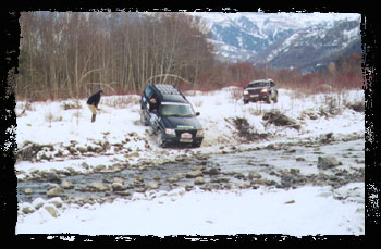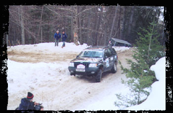 DAY 3: The final day's stages started at Saint Jean- Saint Nicholas. This route involved some quite tricky hillclimbs with treacherous rocks that will break your snow chains if you get it wrong. Everyone by now was driving like old hands and made light work of it. I continued my 2-wheel drive quest for a lot of it and we all had a good time. We did get held up a fair amount by lesser vehicles ahead of us resulting in us having yet another late lunch. Another factor that made us late was the unfortunate demise of the Rubicon Cherokee. As we were about to enter into the River Drac riverbed the steering box decided to break its mounting bolts leaving us with no steering. This vehicle has done nearly 50,000 miles of mostly abuse off-road, so I figure it is entitled to have the odd breakage. We recovered it back to the road and locked it up and continued. Grand Cherokees crossing the River DracWe wandered off into the riverbed and posed for photos etc. There was one bank with a vertical drop of about 1.5 metres that originally had some logs to create a ramp to enable the vehicles to get down it. They had broken away leaving a severe drop. The wrangler wandered down it with no problems, but it was obvious that the GCTD's would hang up, so Ben and myself did a recce and used the Wrangler to clear a route through some deepish snow and saplings for the GCTD's to come through. By the time we got to the lunchstop and finished lunch the course was only going to be open for another hour, so we called it a day and headed back. The end of another excellent event. We managed to arrive late at the prize giving to discover that Gordon and Donies secret weapon had worked and they had won a prize. Well done lads!