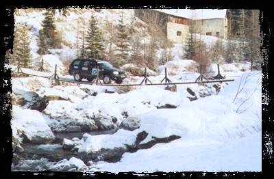 DAY 2: We started the second day at Merlette. This route usually has the most snow and is fairly tricky in places. Having fitted the chains we headed off. The first obstacle is a very narrow cutting with a sheer drop off to the left of probably 50' and a vertical face on the right with rocky outcrops. To make matters worst the entrance has a telegraph pole that will take the side of the vehicle out if you hit it. I went down first in the Wrangler and then went back with a walky talky and guided the GCTD's through. It was tight but we managed without drama. Once that was out of the way we carried on through some lovely deep snow stopping for photos en route. I got a call from Kenny Shann who had managed to tear a front brake hose off when a branch got caught in his snow chains. I had a spare with me so I left it at a street sign where he could find it and we pushed on. We had a super day with everybody taking turns behind the wheel of all the vehicles. Grand Cherokee crossing suspension bridgeThis is my favourite route because it always has snow and some very interesting tracks. This route involves crossing over a suspension bridge that is a great photo opportunity. There is also a super hillclimb that had been shut when we got there. Apparently a 6x6 Pinzgauer had to winch itself up, so the marshal's decided to divert the traffic. It was a real pity because I believe that that we would have got up it having cleared it in the past. The 3 well-sorted Land Rovers belonging to the Reading lads were at the start line at the bottom when the marshals shut the hill. They were not impressed; given the chance they would probably have driven around the Pinzgauer and given it a tow to the top.