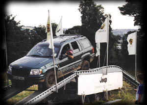 I had to be down at the Surrey Off-Road workshops for around 06:00, so, for me it meant a very early start. Having loaded the vehicles and roughed out a route we collected Iris (a friend of Chris’s over from Germany for a few weeks) and headed for the M25, enroute to pick up the M1 North to Sheffield. As I followed Chris in his coil sprung YJ up the motorway our little two Jeep convoy got its fair share of interest from other drivers. Maybe I was beginning to understand this ‘Jeep thing’. There again, I think we were upstaged by the group of classic Mercedes also headed north on the M1. Iris was in charge of the map and all was going well until we hit Sheffield. In the end it took us an hour and half to negotiate the various one-way systems, tramways and housing estates, before heading out on the road to Worral and the Jeep Fest site at Middlewood Hall. I think Iris had lost the plot, even if she did keep assuring us she knew where she was. Chris took us on a tour of the industrial sector. This looked like something out of an early James Bond set. I kept expecting to see an Aston Martin come screaming round the corner rapidly persued by Odd-Job! Eventually after some help from one of the locals we were back on track. I’d also lost track of time (Sheffield seems to do that to people – they lose all sense of time and direction) but, eventually we arrived. First on the agenda, unfortunately, was to hand over the Rubicon TJ to the Chrysler Jeep Off-Road team. They had set up their stand in an adjacent field and the team was busy demonstrating the latest Jeep Grand Cherokee on their off-road course. Actually when I say demonstrating, Barry, Mick and Roger were actually tutoring the drivers from the passenger seat. Understandably the queue waiting to drive Jeep’s latest creation was getting quite long.