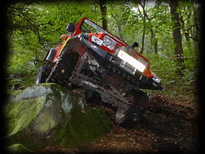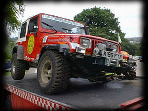 Europe's first two Warn XCL Coil Sprung YJ'sPeter, it turned out had not tried the tougher of the four off-road routes and wanted to drive it before he went home. Trouble was according to Peter’s watch it was twenty to five and everybody else said twenty to six. At which point Peter took the rather expensive looking Lacosse watch off his wrist and stamped on it! Cheep copy apparently – cost less than the replacement battery! The course closed at five o'clock, having got special dispensation from Mark Askew in return for checking that there was nobody left stuck out there, we set off. First obstacle was the bomb-hole. I joined Peter in Godzilla and despite assurances that he had managed the climb out that morning, after three attempts we had to admit defeat. Next was on to the slippery descent with the awkward left hander. The fact that the TJ was automatic meant that Peter had to cover the brakes on the way down. On the slippery surface this was a bit tricky. The diesel Cherokee had been easier; select first low and let the engine braking ‘walk’ the vehicle down. A few shunts at the bottom and a quick ‘juggle’ of the diff-locks and we were round and on down the track. Then off course it was the slippery climb, which had everybody winching up earlier in the day. This time the track was clear of other Jeeps so Chris decided to go for driving it. Peter and I climbed to the top to watch. After a couple of attempts REDOCT seemed to be making good progress until a bump throw threw the Jeep to the side of the track. Then despite the diff-locks the nearside front wheel seemed to have stopped turning. Chris unaware of this knew only that he didn’t seem to be making progress and decided it would be safer to winch up. With the cable attached to the ‘winching tree’ Peter and I stood at the top to watch. It was then that Peter spotted something a bit strange was occurring with the front end of the Jeep. We yelled for Chris to stop and as the winch came to a stop the nearside front corner of the Jeep collapsed to the ground. The wheel just slipped out sideways from underneath the vehicle until the axle hit the ground. We were in trouble! What had looked fairly comical as we stood at the top of the slope was now going to be a major problem. For whatever reason the mount for the bottom end of the kingpin had sheared as had the halfshaft UJ effectively leaving the wheel unattached. As we were standing there assessing the situation, Kenny and Kath turned up in their now repaired TJ. The logistics of recovering the vehicle were getting more complicated by the minute as each one of us considered the engineering involved. There was no way the wheel was going back on so we removed it from the hub. Chris went to lay it on the side of the track but instead it rolled off down the hill and came to rest in the undergrowth! By jacking up the axle we were able to collapse the nearside front spring to some extent. Suddenly long spring travel was definitely going to be a hindrance. The axle was held in position using a self-locking chain. Next the Jeep was lowered back to the bottom of the climb using the winch. Attaching the winch form Godzilla (Peter’s TJ) to the back we were able to slew it round back on to the track at the bottom of the climb. Back in the display area this YJ stayed all nice and clean and shiny!Back on the flat we then attempted to persuade the Jeep to favour lifting the wheel-less corner by compressing the offside rear corner. Patrick ‘big foot’ Kear had turned up by then in his similarly coil-sprung YJ. Ideal candidate to help. With three of us perched on the rear corner we were able to compress the rear spring some way and similarly hold it with a chain. In fact REDOCT was then able to make some progress under it’s own power up the track. When the going got more difficult. The three of us jumped off and Godzilla was back in action with the winch. By now, it was getting dark and Kenny and Kath had to go back to the hotel for dinner. Various other members of the ‘recovery crew’ came and went during what turned out to be a four-hour exercise. Progress was slow and we alternated between winching and towing depending on the terrain. As it got dark communication became a problem. We couldn’t see each other clearly and using the high power lighting only served to blind us from each other. So, we adopted a chain of people to relay messages from REDOCT to Godzilla. Peter was really having to work hard to keep his Jeep in just the right place to prevent REDOCT from being dragged through the trees and undergrowth on the side of the track. Chris was struggling to keep REDOCT on course with severely restricted steering. Just as we were beginning to tire Barry Stallard (of Chrysler Jeeps’ Off-Road Team) arrived with Patrick (back from his dinner). Barry immediately took charge and his calming methodical approach kept us with it. Progress resumed at a steady rate. The last and trickiest stage was to come. We had opted to take the up hill route to the hard track surface. This, we felt, gave us more control than the downhill way. The trouble was the track was deeply rutted, with a few boulders and cross-axles along the way. Whilst Barry organised a double headed pull, stationing Godzilla half way up the climb and Patrick’s YJ at the top, I went off to fetch the Rubicon II as backup. In the end we didn’t need it and eventually with much shuffling of the two recovery vehicles REDOCT was finally back on the tarmac and drove back to the camp. A good job done and a big thanks to all involved. By now it was around ten o’clock and the procession of Jeeps headed back up to the parking area. REDOCT was moving under it’s own power by virtue of the fact that half a dozen people were hanging off the rear corner keeping it balanced. Up at the bar we all in need of a drink. Kenny did the honours and even talked the bar man into rustling up a tray of well-needed sandwiches for those o