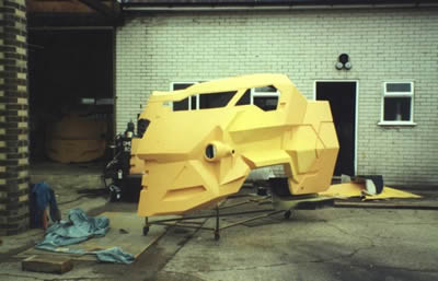 We then set about addressing all the areas needed to bring them up to speed. The first and most difficult area to address was the windscreen. It had to be made from a suitable safety glazing. We found some plastic that met the requirements. The next problem was how we were going to sort out wipers that could sweep the very difficult shape of the screen, more a slit than a window and curving upwards to boot. The vehicles weren’t going to drive any distance in reality, the legal requirement was more so they could park on a public highway MOT’d, taxed and insured and wander around at the premiere. The easiest and cheapest route was to make the screens detachable in the event of rain. If they were removable, they didn’t need wipers or washers. So we made some simple clips that held them in place and by a simple twist of a few clips they came off. With that problem sorted, the next one was how to make it meet lighting legislation. Apparently the cars of the future (according to the designer) have one headlamp and 3 sidelights on the other side of the car! The one headlamp wasn’t even the legal distance in from the side of the car, so we couldn’t use it. I went into our local car accessory shop and found some fairly futuristic looking projector lamps that we used instead. They were upgraded to 65watts and 2 were set for dip beam and all 4 came on for main. They were not brilliant, but were on par with the original 101 lights. We fitted some sidelights and flashers into the recesses in the front skirt. We made up a firewall around the fuel tank that was mounted across the back of the chassis inside the shell. The next problem was wheels and tyres. For the film they were using the standard 101 wheels turned inside out with fibreglass shells on the outside that made it look as though it had big fat tyres. These obviously couldn’t be used on road, so we had some custom 10x15 steel wheels made that we fitted 35x12.50x15 Good Year tyres on and then trimmed the original fibreglass centres down to finish them off. We fitted some rear view mirrors on and headed off to the MOT.