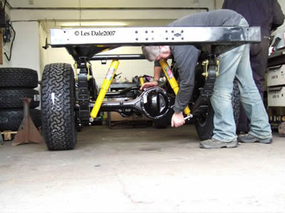 The axles were painted and rebuilt with new bearings, seals and gaskets; a good second-hand diff was fitted in the rear. It had all new brakes on the rear. The front axle was rebuilt and we upgraded the hubs to HJ60 (from the breaker) and fitted the bigger stub axles, hubs and disc brakes. All the steering rods and joints were replaced. Once the suspension materialised we were able to turn it into a gleaming rolling chassis. Les meticulously worked his way though everything, replacing all the brake lines and hoses, using all the original clips etc. It was starting to really look nice. There were problems starting to surface though. The original budget had been long spent and Paul was getting upset at what the final costs were starting to look like. The distractions with the other vehicles had also been eating up cash and it was looking as though the project might stall. However, after a short break and some discussions the decision was made to push on and get it finished.