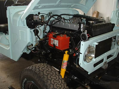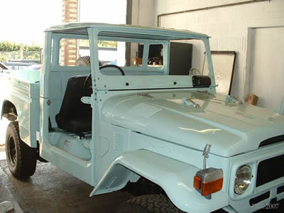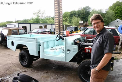 Paul would repair the bodywork himself at home, in an effort to economise, plus he wasn’t getting involved in the hands on side of the project, which was what he had really wanted to do from day one. So all the front panels and the cab were shipped off to his house where he really jumped in at the deep end and got stuck in cutting out the rust and welding and fabricating parts. Meanwhile we carried on with the mechanics. Les rebuilt the engine and replaced parts as necessary in the gearbox and transfer case. The completed units were then fitted into the rolling chassis; both prop shafts were rebuilt and duly fitted. The reconditioned radiator was installed and the day came to fire up the engine. It was started for the first time with the cameras rolling. It spun over and burst into life! After adjusting the timing it settled into a smooth idle and sounded great. We carried on doing what we could whilst we waited for Paul to finish the cab. Eventually he showed up with this eye burning Duck Egg Blue cab on the back of the other 45, ready to fit. First impressions were “ That is a very loud colour”! I wasn’t sure that I liked it much. I was expecting a Bugatti blue, which I was looking forward to seeing. Anyway we gave it a once over and I have to give Paul credit for his first attempts at repairing rusty bodywork. He had cut out the rust and fabricated new panels to replace the rusty parts, which often involved some quite awkward shapes and contours. He did an excellent job. We carefully mounted the cab on the chassis and proceeded to start bolting the remaining parts onto it. Within a week we had a driving chassis cab. With the cab in place, we could now work out how we were going to mount the Land Rover 110 Hi-Cap rear body on. We had decided to go this route after scrapping the incredibly heavy and very rotten original body. We had measured up a Hi-Cap earlier and it looked like a very acceptable alternative. Paul had sourced a very tidy body and had it painted in the same blue paint. We made up a simple sub frame that allowed the body to mount onto the Toyota chassis, using the original mount positions on both items. Having fitted the body, Roger Craythorne of Land Rovers fame, happened to be in yard one day and looked at the 45 with interest. Apparently he had been tasked to come up with a pick up body for the 109 series III in South America in the late 70’s. He had looked at the 45 to get some ideas and went on to come up with the Hi-Capacity body. He was amused to see that we had done the exact opposite.