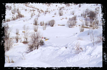 Having posed for a few photos in the snowfield, we headed off down the trail with me up front in the "Rubicon" Wrangler navigating and calling out potential obstacles. Peter Robain was in the passenger seat ready to leap out at any photo opportunity that presented itself. We had a whale of a time and thoroughly enjoyed ourselves. Ben and Barry Hayden were second in the green GCTD with Bob Cooke and Brian Rees in the red GCTD in third and Brian Laban and Barry Stallard following up the rear in the "Rubicon" Cherokee. Unfortunately Gary had turned up with a cold and resembled the walking dead Wednesday, so he opted to have a lie in and try to shake it off.