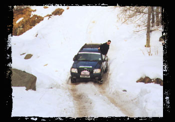 DAY 2: We started the second day at Merlette. This route usually has the most snow and is fairly tricky in places. Having fitted the chains we headed off. The first obstacle is a very narrow cutting with a sheer drop off to the left of probably 50' and a vertical face on the right with rocky outcrops. To make matters worst the entrance has a telegraph pole that will take the side of the vehicle out if you hit it. I went down first in the Wrangler and then went back with a walky talky and guided the GCTD's through. It was tight but we managed without drama. Once that was out of the way we carried on through some lovely deep snow stopping for photos en route. I got a call from Kenny Shann who had managed to tear a front brake hose off when a branch got caught in his snow chains. I had a spare with me so I left it at a street sign where he could find it and we pushed on. We had a super day with everybody taking turns behind the wheel of all the vehicles. Grand Cherokee crossing suspension bridgeThis is my favourite route because it always has snow and some very interesting tracks. This route involves crossing over a suspension bridge that is a great photo opportunity. There is also a super hillclimb that had been shut when we got there. Apparently a 6x6 Pinzgauer had to winch itself up, so the marshal's decided to divert the traffic. It was a real pity because I believe that that we would have got up it having cleared it in the past. The 3 well-sorted Land Rovers belonging to the Reading lads were at the start line at the bottom when the marshals shut the hill. They were not impressed; given the chance they would probably have driven around the Pinzgauer and given it a tow to the top.