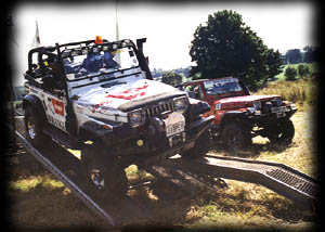 Europe's first two Warn XCL Coil Sprung YJ'sPeter, it turned out had not tried the tougher of the four off-road routes and wanted to drive it before he went home. Trouble was according to Peter’s watch it was twenty to five and everybody else said twenty to six. At which point Peter took the rather expensive looking Lacosse watch off his wrist and stamped on it! Cheep copy apparently – cost less than the replacement battery! The course closed at five o'clock, having got special dispensation from Mark Askew in return for checking that there was nobody left stuck out there, we set off. First obstacle was the bomb-hole. I joined Peter in Godzilla and despite assurances that he had managed the climb out that morning, after three attempts we had to admit defeat. Next was on to the slippery descent with the awkward left hander. The fact that the TJ was automatic meant that Peter had to cover the brakes on the way down. On the slippery surface this was a bit tricky. The diesel Cherokee had been easier; select first low and let the engine braking ‘walk’ the vehicle down. A few shunts at the bottom and a quick ‘juggle’ of the diff-locks and we were round and on down the track. Then off course it was the slippery climb, which had everybody winching up earlier in the day. This time the track was clear of other Jeeps so Chris decided to go for driving it. Peter and I climbed to the top to watch. After a couple of attempts REDOCT seemed to be making good progress until a bump throw threw the Jeep to the side of the track. Then despite the diff-locks the nearside front wheel seemed to have stopped turning. Chris unaware of this knew only that he didn’t seem to be making progress and decided it would be safer to winch up. With the cable attached to the ‘winching tree’ Peter and I stood at the top to watch. It was then that Peter spotted something a bit strange was occurring with the front end of the Jeep. We yelled for Chris to stop and as the winch came to a stop the nearside front corner of the Jeep collapsed to the ground. The wheel just slipped out sideways from underneath the vehicle until the axle hit the ground. We were in trouble! What had looked fairly comical as we stood at the top of the slope was now going to be a major problem. For whatever reason the mount for the bottom end of the kingpin had sheared as had the halfshaft UJ effectively leaving the wheel unattached. As we were standing there assessing the situation, Kenny and Kath turned up in their now repaired TJ. The logistics of recovering the vehicle were getting more complicated by the minute as each one of us considered the engineering involved. There was no way the wheel was going back on so we removed it from the hub. Chris went to lay it on the side of the track but instead it rolled off down the hill and came to rest in the undergrowth! By jacking up the axle we were able to collapse the nearside front spring to some extent. Suddenly long spring travel was definitely going to be a hindrance. The axle was held in position using a self-locking chain. Next the Jeep was lowered back to the bottom of the climb using the winch. Attaching the winch form Godzilla (Peter’s TJ) to the back we were able to slew it round back on to the track at the bottom of the climb. Back in the display area this YJ stayed all nice and clean and shiny!Back on the flat we then attempted to persuade the Jeep to favour lifting the wheel-less corner by compressing the offside rear corner. Patrick ‘big foot’ Kear had turned up by then in his similarly coil-sprung YJ. Ideal candidate to help. With three of us perched on the rear corner we were able to compress the rear spring some way and similarly hold it with a chain. In fact REDOCT was then able to make some progress under it’s own power up the track. When the going got more difficult. The three of us jumped off and Godzilla was back in action with the winch. By now, it was getting dark and Kenny and Kath had to go back to the hotel for dinner. Various other members of the ‘recovery crew’ came and went during what turned out to be a four-hour exercise. Progress was slow and we alternated between winching and towing depending on the terrain. As it got dark communication became a problem. We couldn’t see each other clearly and using the high power lighting only served to blind us from each other. So, we adopted a chain of people to relay messages from REDOCT to Godzilla. Peter was really having to work hard to keep his Jeep in just the right place to prevent REDOCT from being dragged through the trees and undergrowth on the side of the track. Chris was struggling to keep REDOCT on course with severely restricted steering. Just as we were beginning to tire Barry Stallard (of Chrysler Jeeps’ Off-Road Team) arrived with Patrick (back from his dinner). Barry immediately took charge and his calming methodical approach kept us with it. Progress resumed at a steady rate. The last and trickiest stage was to come. We had opted to take the up hill route to the hard track surface. This, we felt, gave us more control than the downhill way. The trouble was the track was deeply rutted, with a few boulders and cross-axles along the way. Whilst Barry organised a double headed pull, stationing Godzilla half way up the climb and Patrick’s YJ at the top, I went off to fetch the Rubicon II as backup. In the end we didn’t need it and eventually with much shuffling of the two recovery vehicles REDOCT was finally back on the tarmac and drove back to the camp. A good job done and a big thanks to all involved. By now it was around ten o’clock and the procession of Jeeps headed back up to the parking area. REDOCT was moving under it’s own power by virtue of the fact that half a dozen people were hanging off the rear corner keeping it balanced. Up at the bar we all in need of a drink. Kenny did the honours and even talked the bar man into rustling up a tray of well-needed sandwiches for those o