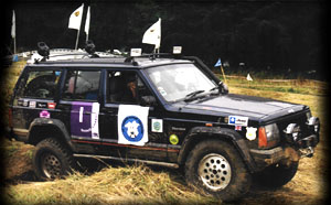 Chris decided he wanted to go ‘play’ so, we left them to it. Along with Chris from Intamech the three of us headed for the off-road route in REDOCT. The easy section was in an open area next to the campsite. There was a short muddy section along the top edge of the field and what can best be described as a ‘bomb-hole’ full of water in the middle. REDOCT took the short section in its stride and in fact there was a YJ in front on All Terrain's and apparently still in two-wheel drive only making slightly heavy work of it. The ‘bomb-hole’ was capturing the interest. Essentially the hole had two entries and one exit or two exits and one entry if you approached it from the other end! Several of the ‘stock’ vehicles were getting hung up dropping into the hole but it was getting out that was giving the most fun. About then Barry, having managed to escape for a while, turned up in the Rubicon I – Jeep Cherokee. The back seat of the Wrangler was getting a bit ‘friendly’ so when he called me over I was more than happy to trade for the passenger seat of the Cherokee. Little did I know what I had let myself in for! Both vehicles despite differing wheelbases dropped into the hole and up out the otherside with out any problems. Going out the other way was were the fun started. The steeper exit, obviously the one to choose, had a nice little cross-axle at the top. Several vehicles had tried and failed before Chris had a go in REDOCT. After three attempts he conceded and left by the other route. Barry was convinced he could make it. In fact he had already taken one of the Grand Cherokees up it with a customer earlier that morning. By now however, the route was ‘chewed up’ from several failed attempts by other drivers. In the end the Cherokee, like the Wrangler, made it to the crest but couldn’t maintain the traction to pull it over. Again the diesel powered Rubicon Cherokee had proved it was capable of matching the Wranglers. Leaving by the other route however, was not without a minor drama. On the right hand side was a narrow gully with a rock either side ready to grab an unsuspecting tyre in a pincer grip. As we crested the climb the hiss of escaping air confirmed the worst. Seeing as how Barry had been nice enough to invite me along the least I could do was change the tyre. The Rubicon Cherokee carries two spares. The Hi-Lift made short work of jacking up the car by the side-rail. With the tyre changed we headed for the harder route!