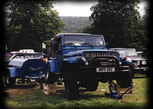 The main display arenaBack in the main show area we spotted two very familiar TJ’s; Kenny Shann’s and Peter Roach’s. Peter it turned out had escaped for the day, his wife Jackie had declined in favour of going shopping! He’d been there a while and had already driven some of the course, including completing the climb out of the ‘bomb-hole’ that the rest of us had failed at. Kenny and Kath had also been out on the course already but were having some problems with overheating on ‘Daisy’ their TJ. The remains of the afternoon were spent in search of a replacement fan. Chris however, managed to get side tracked into fixing an electric wheel chair – is there no end to this man’s talents! Kenny had managed to find a rather old fixed fan assembly probably from a Willys! Chris was a little dubious about fitting it in case it caused more problems. Eventually with the aid of Peter’s faithful biscuit tin, which contains spanners of all sizes for all occasions, the fan unit was re-assembled until a proper replacement was found.