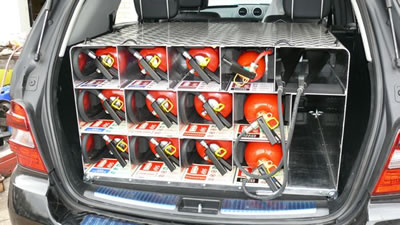 We fitted some tie down points on the top to allow light equipment such as coats and dungarees to be bungeed on. The pod has sponge-lined pigeonholes at the rear with the extinguishers laying flat inside. They are not secured and are easily extracted when needed. The tailgate acts as a door to pod keeping them all in contained safely. There is a bulkhead at the front that prevents them travelling forward under hard braking etc. In front of the extinguishers there is an open fronted locker for fire helmets and the other equipment needed when putting out a fire. Tipping the middle row of seatbacks forward accesses this area. When the seats are locked back in their usual upright position, they provide a secure bulkhead for the gear stowed in there. Hopefully it will not see any action, but if it is needed it has a wide range of extinguishers for pretty well any eventuality. Each pigeon hole has a sign explaining which extinguisher lives in there and what sort of fires it will work on, so in a panic, it should be easy to select the right one for the job.