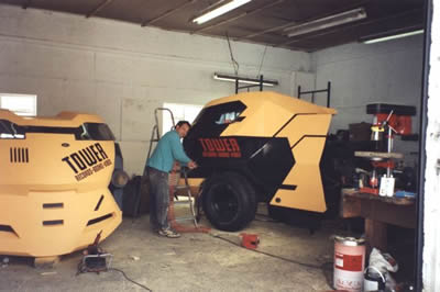 We then set about addressing all the areas needed to bring them up to speed. The first and most difficult area to address was the windscreen. It had to be made from a suitable safety glazing. We found some plastic that met the requirements. The next problem was how we were going to sort out wipers that could sweep the very difficult shape of the screen, more a slit than a window and curving upwards to boot. The vehicles weren’t going to drive any distance in reality, the legal requirement was more so they could park on a public highway MOT’d, taxed and insured and wander around at the premiere. The easiest and cheapest route was to make the screens detachable in the event of rain. If they were removable, they didn’t need wipers or washers. So we made some simple clips that held them in place and by a simple twist of a few clips they came off. With that problem sorted, the next one was how to make it meet lighting legislation. Apparently the cars of the future (according to the designer) have one headlamp and 3 sidelights on the other side of the car! The one headlamp wasn’t even the legal distance in from the side of the car, so we couldn’t use it. I went into our local car accessory shop and found some fairly futuristic looking projector lamps that we used instead. They were upgraded to 65watts and 2 were set for dip beam and all 4 came on for main. They were not brilliant, but were on par with the original 101 lights. We fitted some sidelights and flashers into the recesses in the front skirt. We made up a firewall around the fuel tank that was mounted across the back of the chassis inside the shell. The next problem was wheels and tyres. For the film they were using the standard 101 wheels turned inside out with fibreglass shells on the outside that made it look as though it had big fat tyres. These obviously couldn’t be used on road, so we had some custom 10x15 steel wheels made that we fitted 35x12.50x15 Good Year tyres on and then trimmed the original fibreglass centres down to finish them off. We fitted some rear view mirrors on and headed off to the MOT.